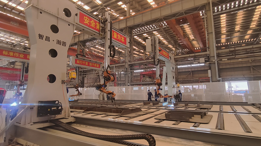 以數據驅動為核心,智昌集團為船舶行業構建了涵蓋智能焊接、物流、調度與決策支持的一體化系統。智能焊接部分采用具備3D視覺智能機器人,實現對焊縫的自動識別與高精度路徑規劃。物流系統通過多臺重載RGV與桁車協同,配合首創的力感仿手翻板機,完成大型工件的自動輸送與安全翻轉。調度系統與集團生產平臺實時對接,驅動信息化分揀與配送機制,應對多品種物料的精準管理。數字孿生平臺將物理產線全要素映射至虛擬空間,實現全過程可視化監控與數據聯動。此外,基于行業工藝數據訓練的工業大模型,為操作人員提供實時輔助,推動知識經驗的結構化沉淀與傳承。